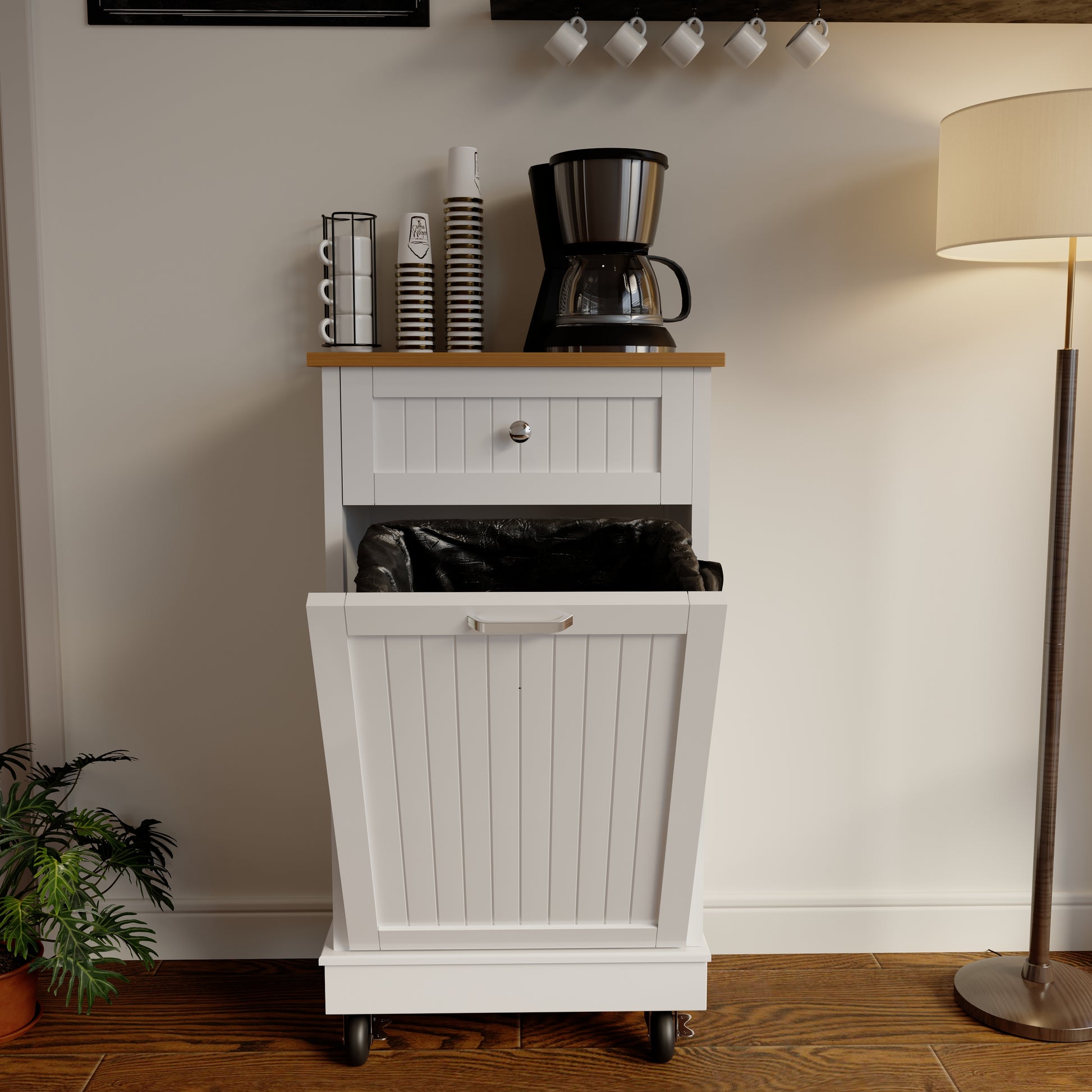 Tilt Out Trash Can Cabinet The tilt-out trash can holds up to 10 gallons of trash and is a great way to hide your trash can while give your kitchen more cleaner floors. The wooden countertop brings you more organizing space to keep items in place