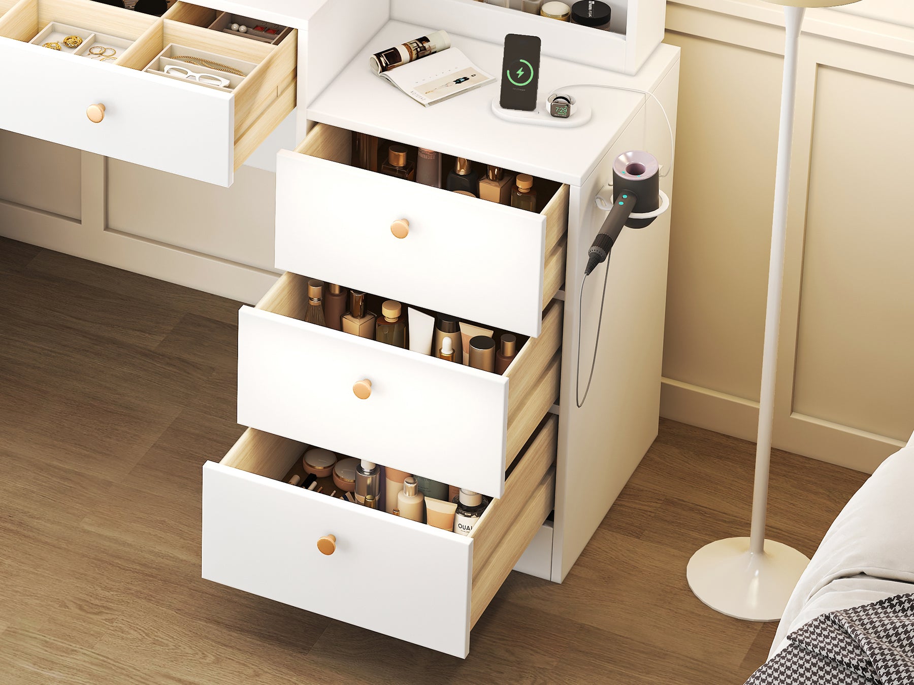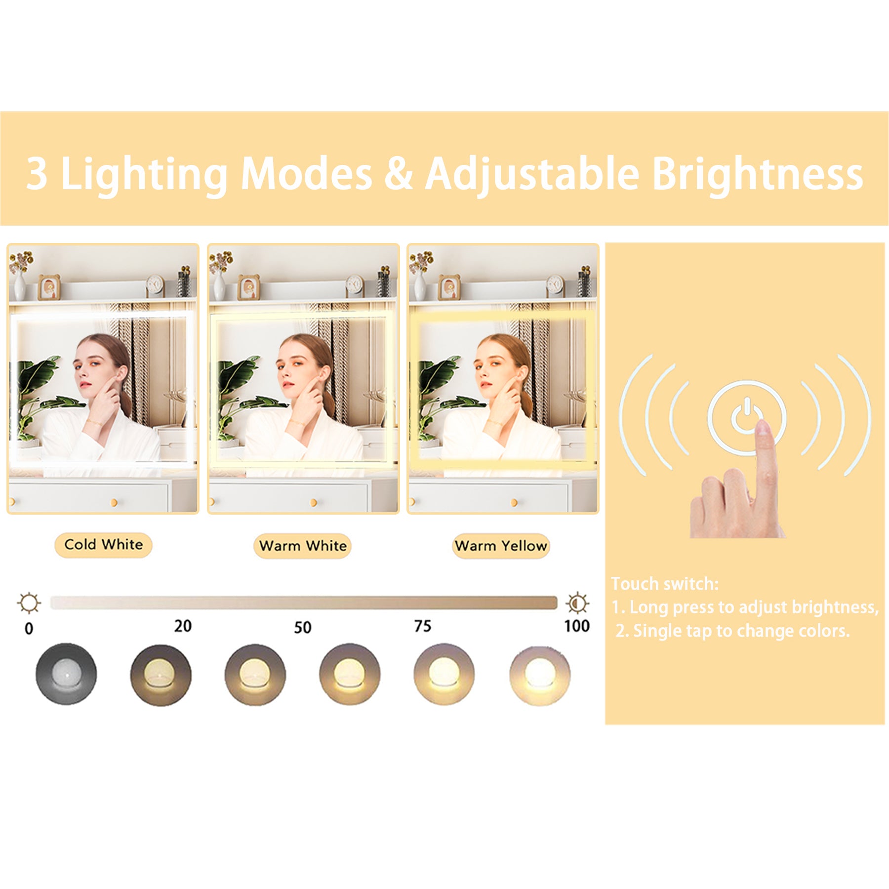 - Adjustable LED Lights & Power Outlets: With this vanity’s built-in mirror and lights, featuring 3 adjustable modes (cool white, warm white, warm yellow) that perfectly match any makeup look or skincare routine. It comes with built-in power outlets (2 AC + 2 USB ports) to keep your hair dryer, curling iron, and phone juiced up—no more hunting for plugs! Plus, the handy hair dryer holder adds that extra touch of convenience.