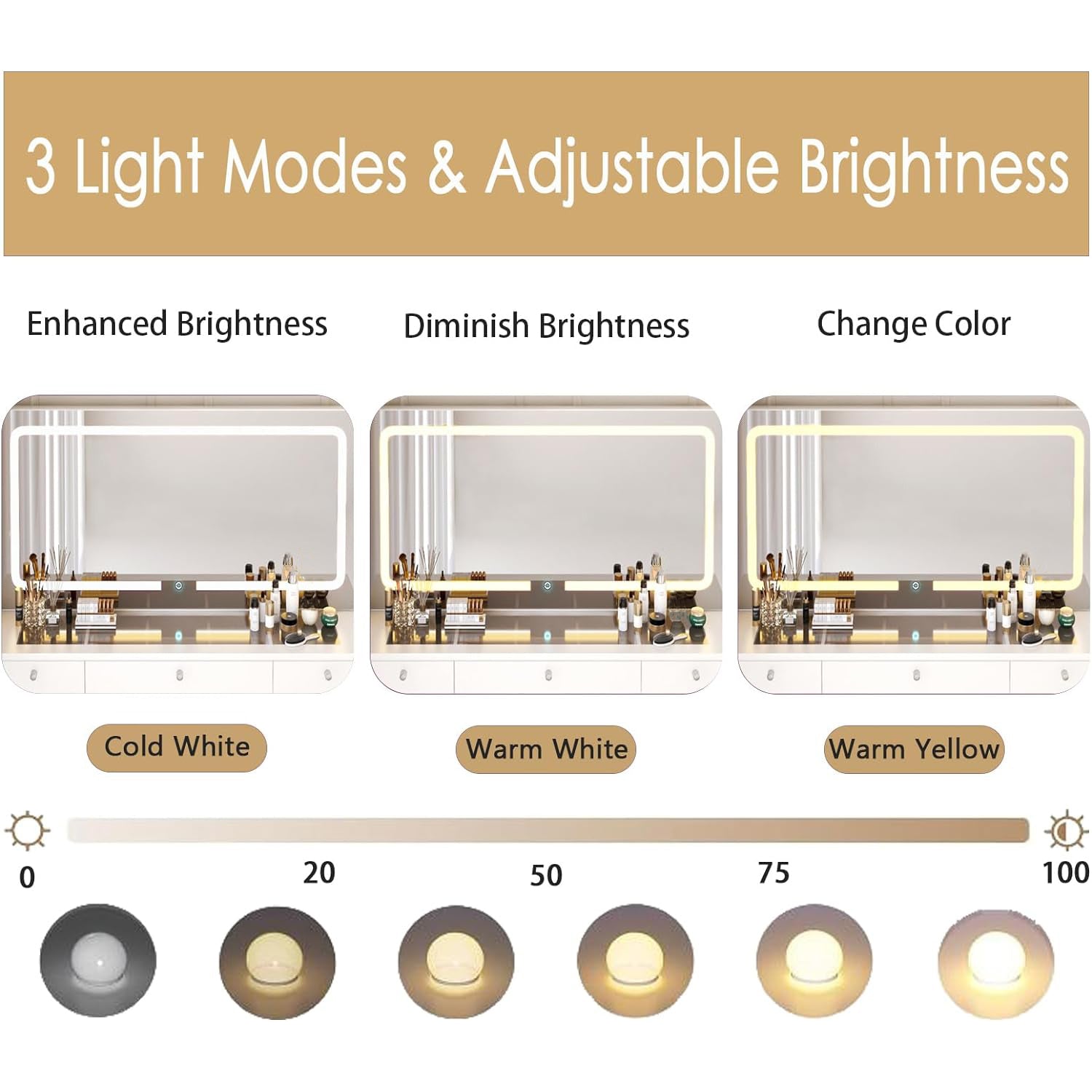 - LIGHTS ADJUSTABLE Our vanity desk has 3 different colors of light for you to choose from (cold white, warm white, warm yellow) to make you look beautiful easily
